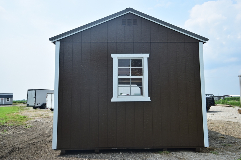• Brown 28x12 Shed with a single door and garage door